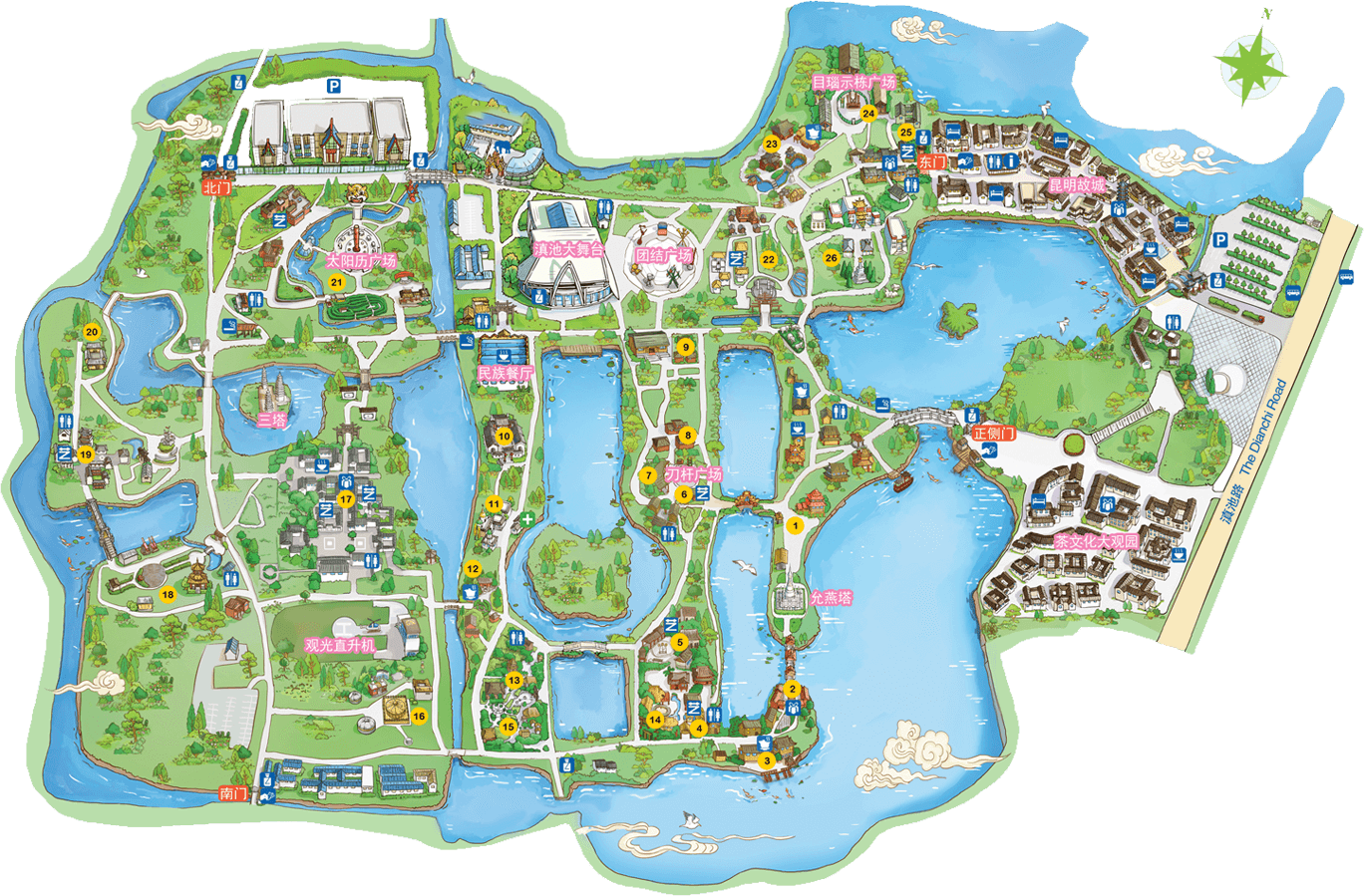 傣族人口約107萬人,主要分布在云南的德宏傣族景頗族自治州、西雙版納傣族自治州及瀾滄江流域的河谷壩子區域。傣族寨是進入民族村的第一個村寨,占地面積27畝,三面環水,綠樹掩映。一幢幢“干欄式”傣家竹樓,通過蜿延的紅砂石小徑聯向肅穆的緬寺。巍峨壯觀的白塔,精巧玲瓏的風雨橋,以及風雨亭、水井、鐘亭等建筑充滿著傣家的濃郁風情,是傣寨真實的民間景觀再現。一年一度的“潑水節”期間,這里都有活潑歡快的“象腳鼓舞...
